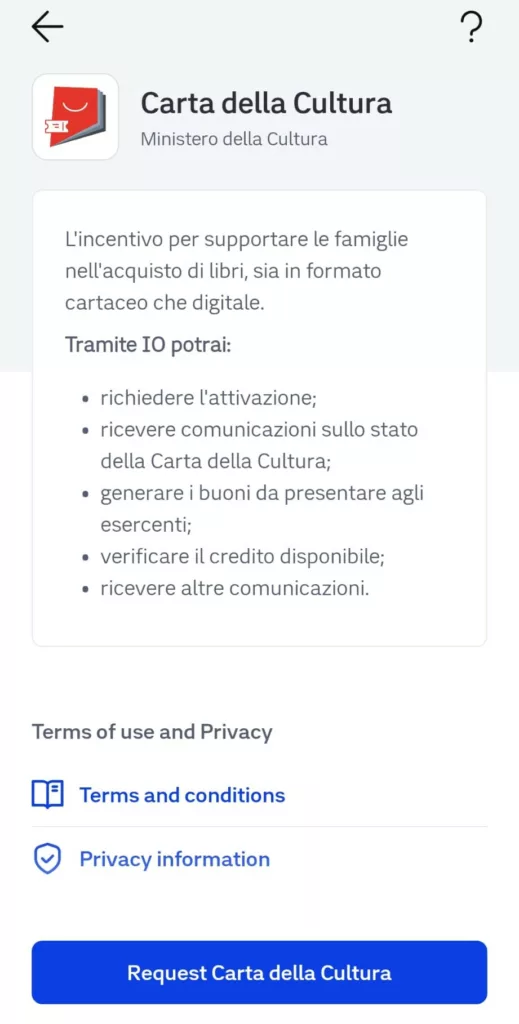 - cercare e selezionare il servizio “Carta della Cultura”;